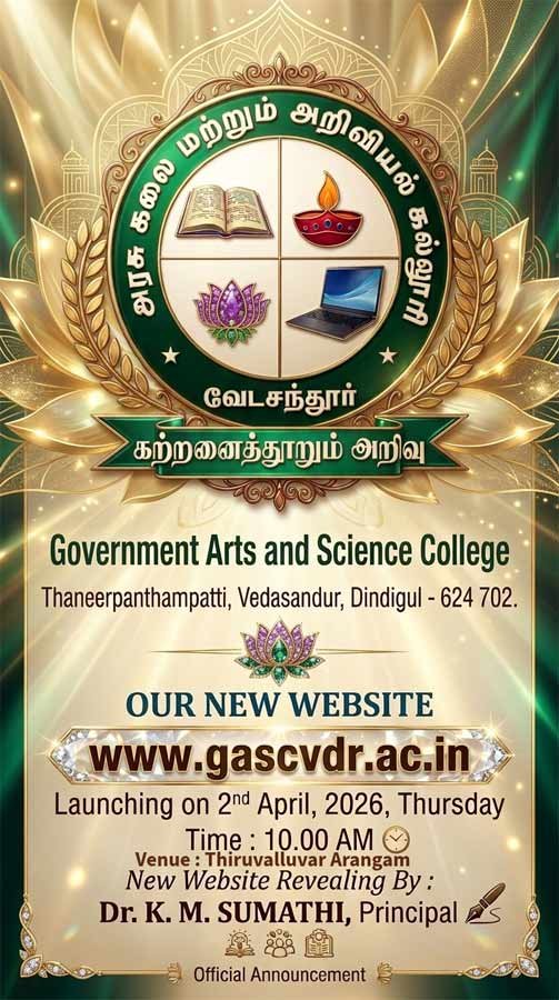 This is to inform all faculty, administrative members and students that the new official portal for Government Arts and Science College, Vedasandur will be launched this Thursday(02.04.2026).